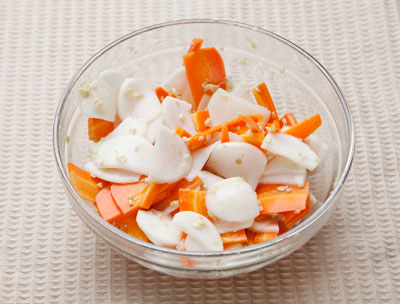 - じゃがいも、にんじん、ブロッコリーを適当な大きさに切って、レンジにかけ、柔らかくする。
